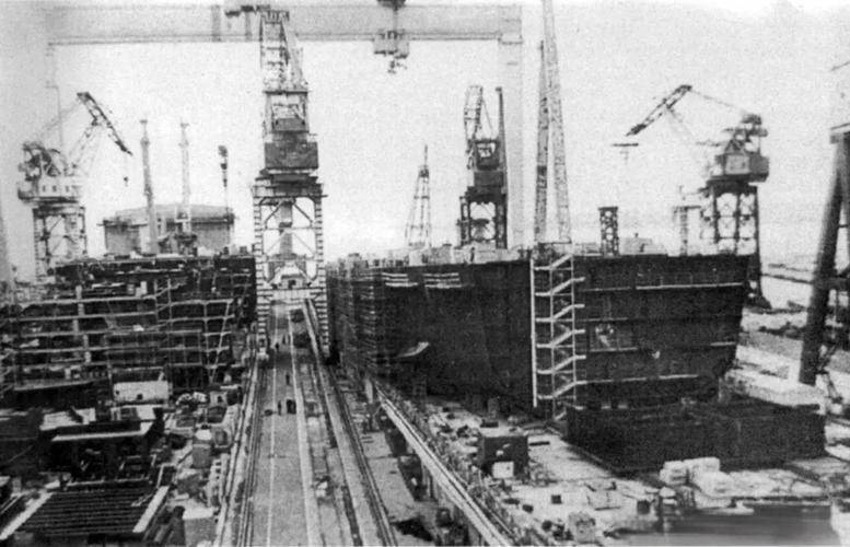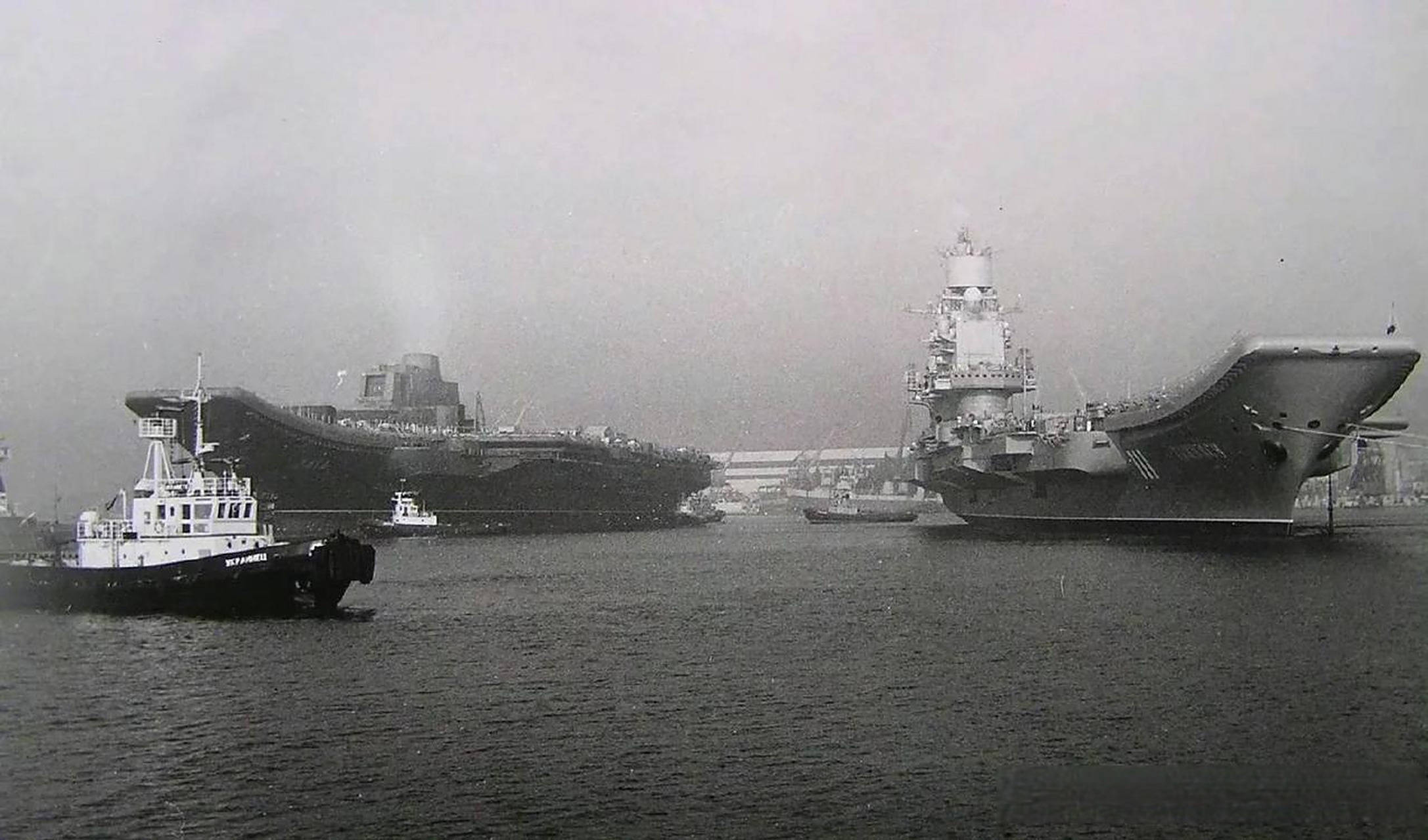 然后呢,当年苏联的主要军工企业,和造船工业,都放在了乌克兰。当时的乌克兰黑海造船厂,是苏联时代最大的造船厂,光是厂里的船台上,就有3艘航母在同时建造。下图就是同时在黑海造船厂建造的库兹涅佐夫号和瓦良格号。